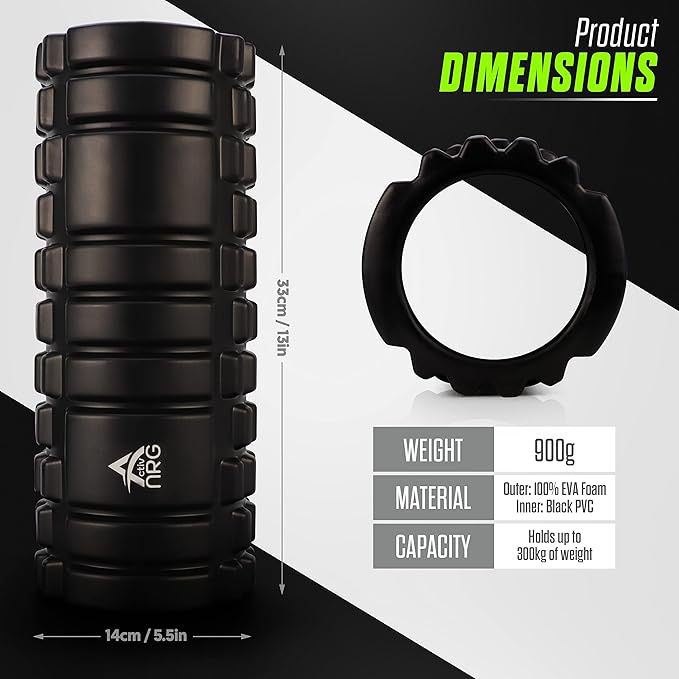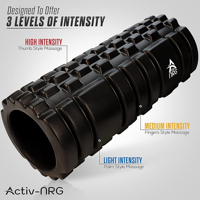 Possibilités infinies : le rouleau de massage et de fitness en mousse Activ-NRG a une multitude d'utilisations, y compris les étirements pré-exercice, la récupération après l'exercice, l'amélioration de l'équilibre et de la force musculaire, le réalignement de la posture et le travail des muscles fatigués et tendus, les tissus cicatrices et les nœuds. Notre rouleau de massage peut aider à récupérer des blessures, des douleurs dans le bas du dos et d'autres maladies chroniques (veuillez toujours consulter votre médecin ou kinésithérapeute avant d'utiliser un rouleau en mousse car il peut ne pas vous convenir).